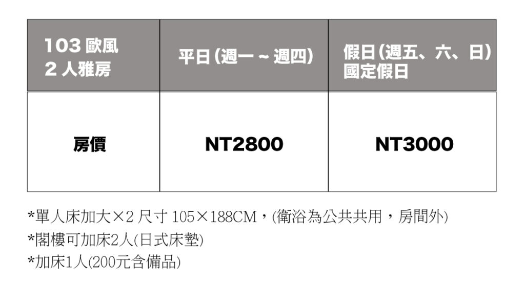 ※此房型有一閣樓,可加床2位(日式床墊),站起高度約100公分,適合15歲以下。成人稍偏壅擠。